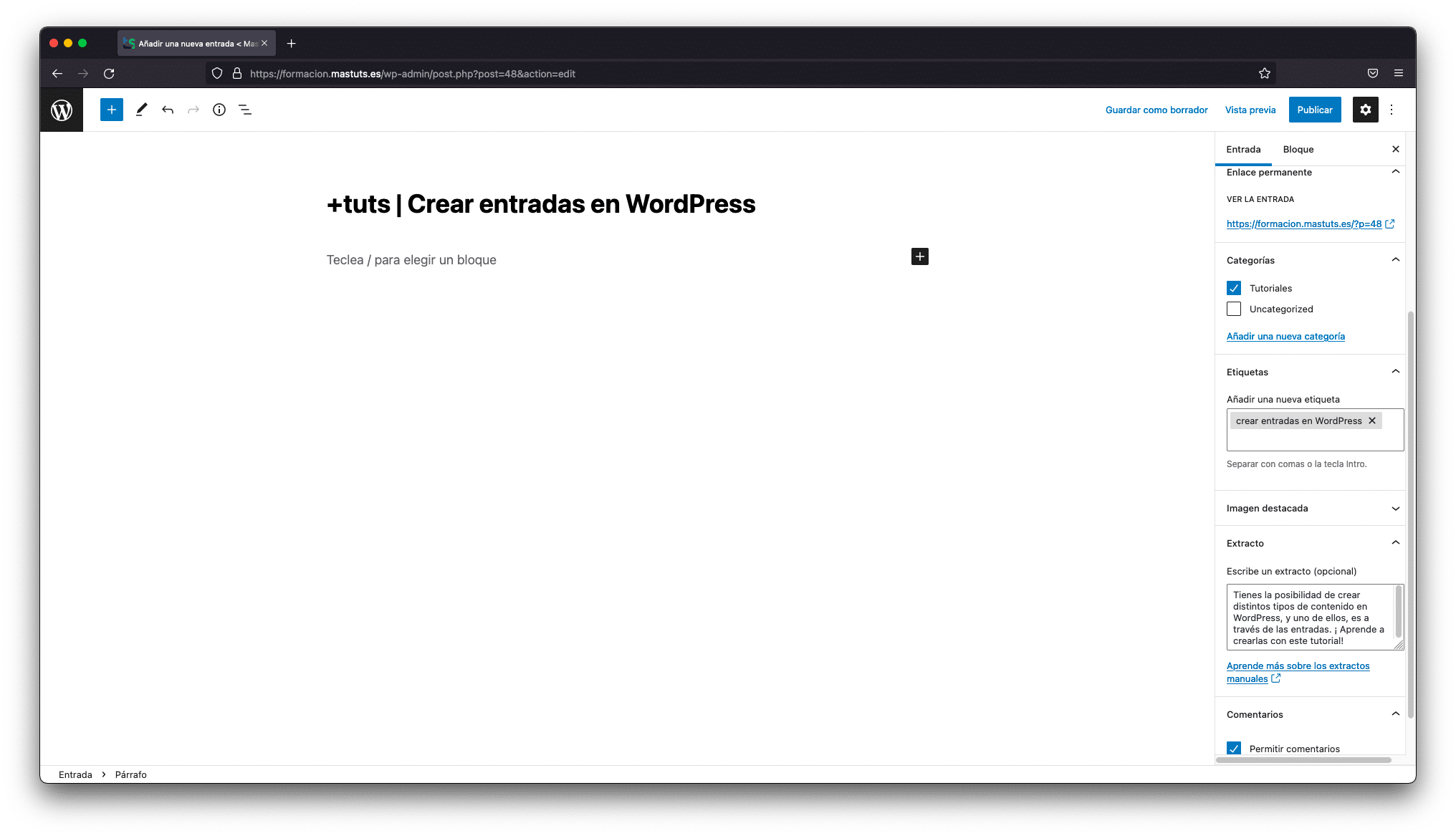 - Enlace permanente: así es como aparecerá la URL de la entrada.