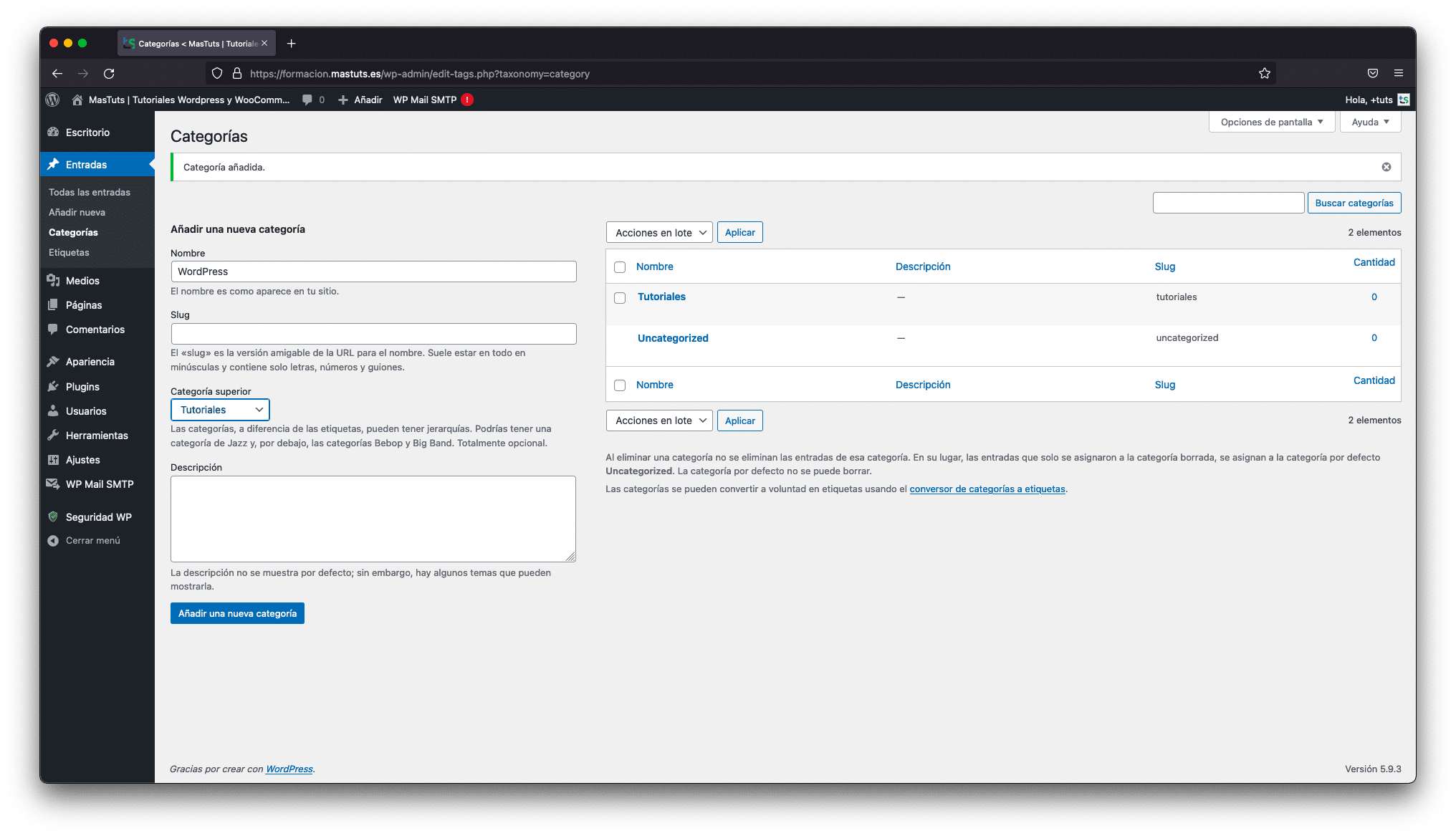 1. En el panel de WordPress, haz clic en «Entrada». En el mismo panel, justo debajo de «Entrada», te van a aparecer más opciones, entre ellas «Categorías» y «Etiquetas». Haz clic en cualquiera de ellas y te aparecerá en la izquierda para que rellenes los datos como el nombre o la descripción. Si dejas en blanco el slug (la URL), WordPress automáticamente te generará la URL a partir del nombre que le hayas puesto. Cuando lo tengas, haz clic en «Añadir nueva etiqueta/categoría».